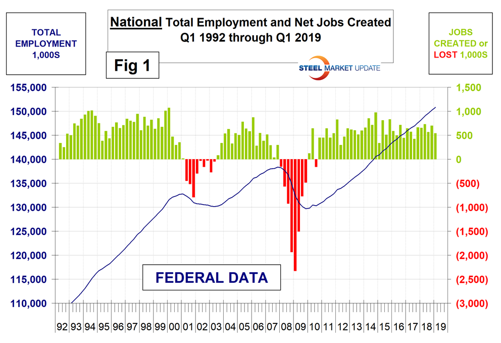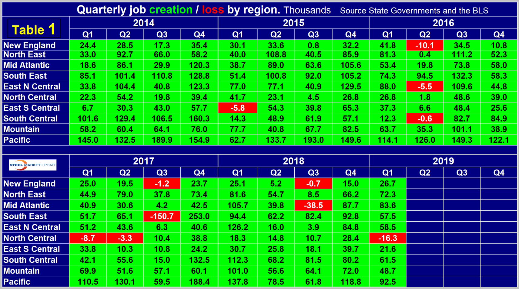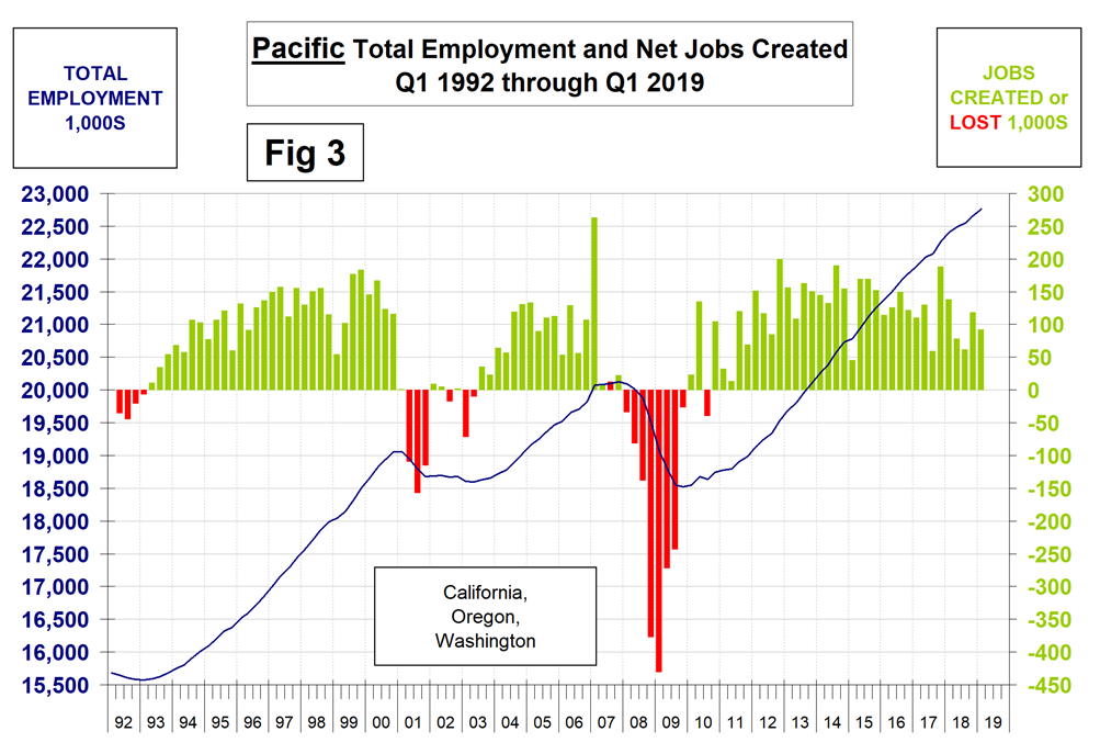 Table 1 shows the history of quarterly job creation by region since Q1 2014. In Q4 2018 and Q1 2019, the Pacific region created the most jobs. The numbers are seasonally adjusted and all except the North Central region had a positive net gain in Q1 2019.
