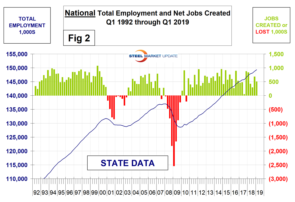 The states compile their employment numbers independently of the Feds, and then both are reported by the BLS. In the six years since and including Q1 2013, the Feds reported total job creation of 15,752,000 and the states reported 14,993,000. Our report covers only the lower 48 states, and the state numbers don’t include those such as the military that are employed overseas. Therefore, the federal and state totals are impressively close. Figure 1 shows the history of federal data totals since 1992 and Figure 2 shows the same format for the state data.