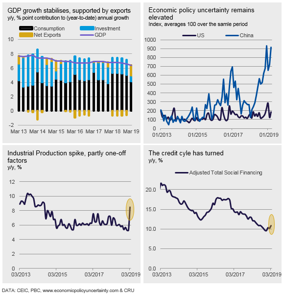 The first chart above shows that growth in Q1 was supported by a rebound in net exports, and solid consumption—investment contributed less to growth than it did last year. The strength in exports is likely to reflect the trade truce with the U.S., where tariffs on Chinese goods have remained at 10 percent—and not increased to 25 percent. The positive signals from the U.S.-China trade talks, and the new stimulus announced by China at the National People’s Congress (NPC) in March, is likely to have boosted confidence.