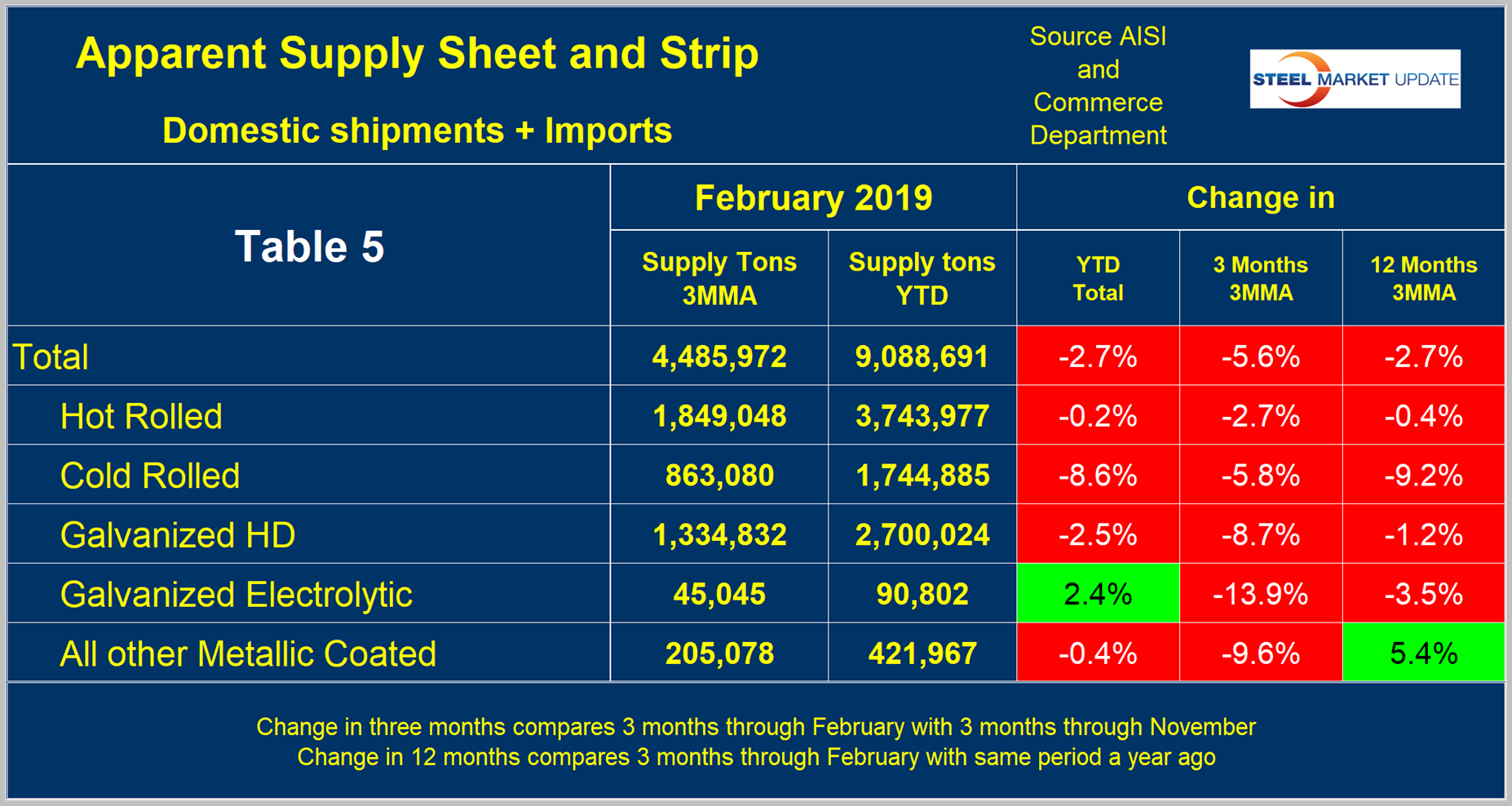 The analysis summarizes total steel supply by product from 2003 through February 2019 and year-on-year changes. The supply data is a proxy for market demand, which does not take into consideration inventory changes in the supply chain. Our analysis compares domestic mill shipments with total supply to the market. It quantifies market direction by product and enables a side-by-side comparison of the degree to which imports have absorbed demand.