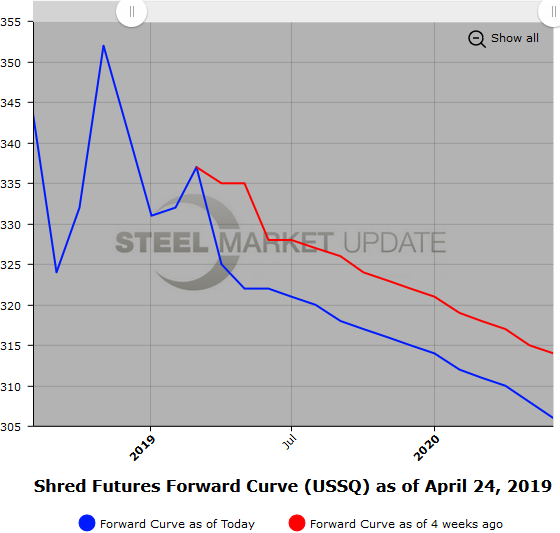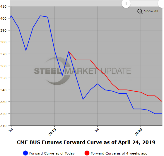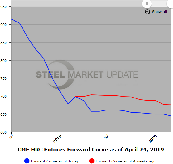 Despite concerns of lower import prices and potential adjustments to the tariffs, the forward curve while backwardated remains relatively flat but at a good discount to the settling month (April 2019 $688/ST). For example, spot month future (May 2019) settlement value is $655/ST versus Dec’19 settlement value of $638/ST. The forward discount is below $1.50/ST per month out 12 months. For comparison of the forward curve, last year on April 24, 2018, May’18 HR was valued at $864/ST versus Apr’19 HR which was valued at $741/ST, a $123/ST discount or average monthly $10.25 discount. Given that the HR prices were at loftier levels, the curve reflected an expectation that prices needed to retrace. At the current lower trading prices the forward curve reflects a fairly neutral bias for prices going forward. However, this week’s selling pressure on prices and the increased activity in time spreads suggests we could be reaching some price equilibrium at least for the near term.