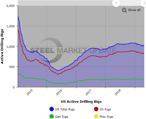 The U.S. active rotary rig count, an indicator of oil country tubular goods demand, decreased this week, according to oilfield services company Baker Hughes. The number of active U.S. rigs fell by 21 to 991, with oil rigs down 20 and gas rigs down 1. Compared to this time last year, the 991 count is down 30 rigs, with oil rigs down 20, gas rigs down 9, and miscellaneous rigs down 1. See the first graph below for a history of active U.S. rig counts.