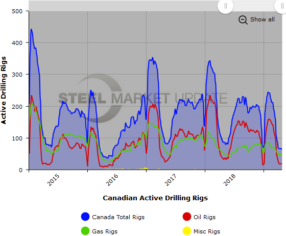 The Canadian rig count declined again this week by 3 rigs to 63 rigs, with oil rigs unchanged and gas rigs down 3. Compared to last year, the 63 count is down 22 rigs, with oil rigs down 14 and gas rigs down 8. See the second graph below for a history of active Canadian rig counts.