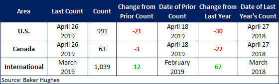The Baker Hughes International Rotary Rig Count is a monthly census of active drilling rigs exploring for or developing oil or natural gas outside of the United States and Canada. International rigs considered active must be drilling at least 15 days during the month. The Baker Hughes International Rotary Rig Count does not include rigs drilling in Russia or onshore China.