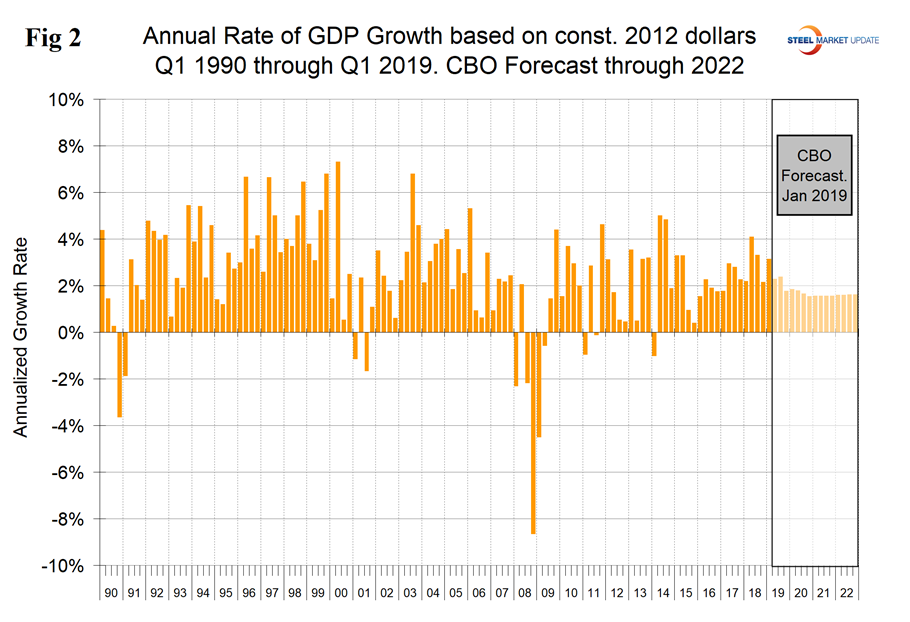 Figure 2 shows the headline quarterly results since 1990 and the January 2019 Congressional Budget Office forecast through 2022. The CBO underestimated the growth rate in Q1 2019 and expects the boost from the tax break to decline by Q3 2019.