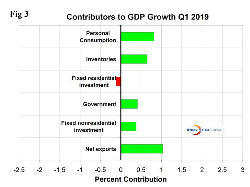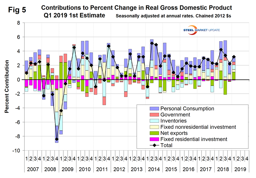 SMU Comment: The trailing 12-month growth rate has improved steadily since Q2 2016. On this basis, which we think is the best way to look at the data, Q1 2019 was the highest result since Q2 2015. The bad news is that personal consumption expenditures made their second lowest contribution since Q2 2013. The latest result was juiced by the contributions of net exports and an increase in inventories.