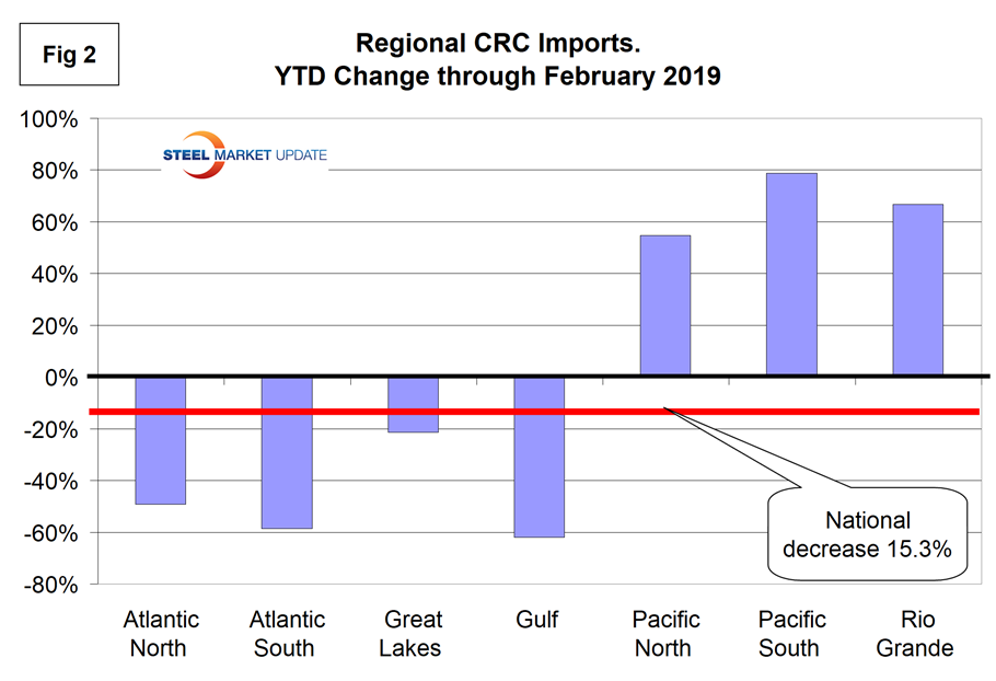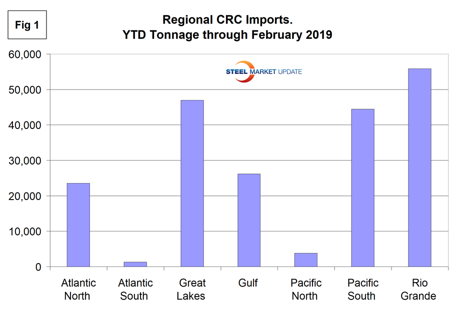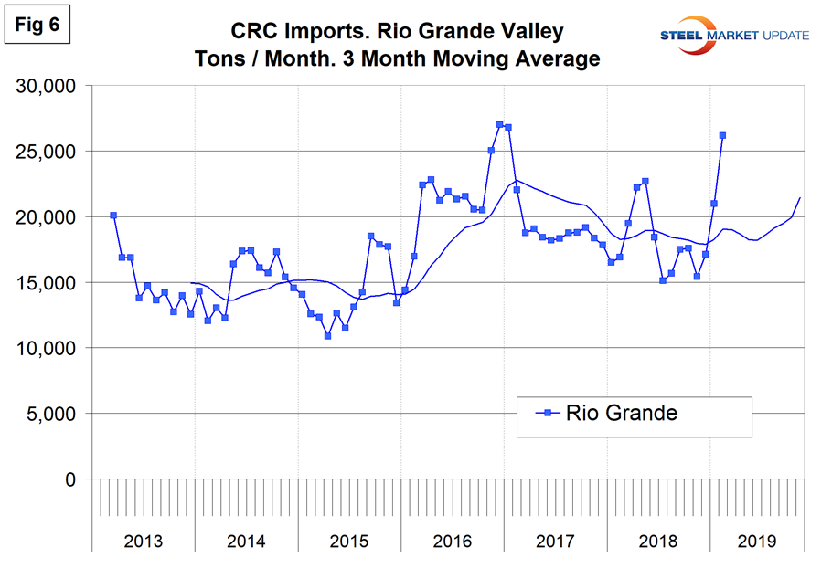 Cold rolled imports from Mexico through Laredo have surged in 2019 making this the highest volume region of entry year-to-date. For the nation as a whole, cold rolled imports year-to-date were down by 15.3 percent, but the Pacific South, (Los Angeles and San Diego) was up by 78.8 percent, according to Steel Market Update’s latest analysis of government data.