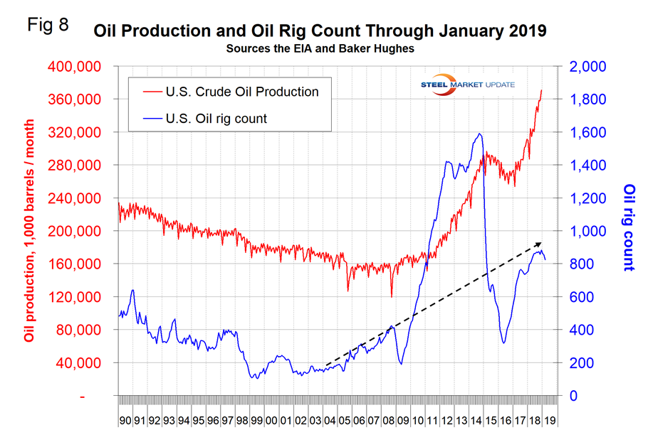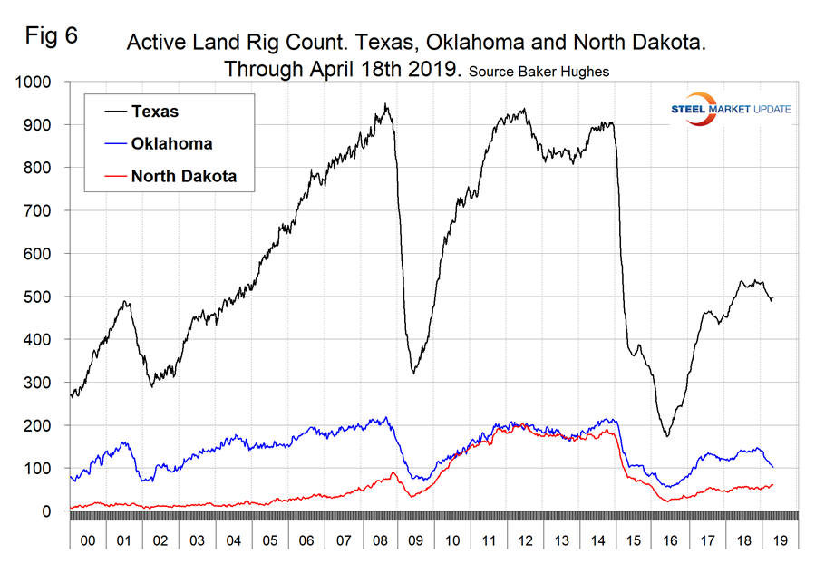 The spot price of West Texas Intermediate (WTI) FOB Cushing, Okla., had a recent peak on Oct. 3 of $76.40 / barrel. The price declined to $44.48 on Dec.27 and had recovered to $63.43 on April 15. The total number of operating rigs exploring for oil has declined by 71 since Jan. 4. The prices of oil and natural gas drive the consumption of energy-related steel products including oil country tubular goods, pipe fittings and well head equipment, among others. Welded tubular goods (not including OCTG) consumed about 5.5 million tons of hot rolled sheet in 2018.
