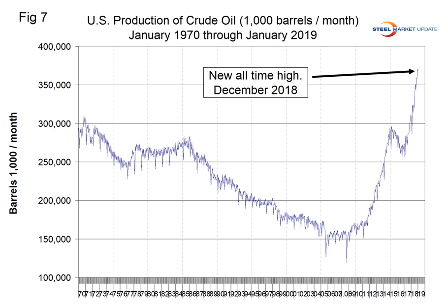 Figure 7 illustrates the monthly U.S. oilfield production of crude from January 1970 through January 2019 (latest data available) in thousands of barrels / month. The historical high was October 1970 at 310.4 million barrels. Production steadily declined to half that level in the late 2000s before the fracking revolution. December 2017 broke the record that had stood for 47 years with 310.7 million barrels produced, and December 2018 set a new record at 370.8 million barrels. January declined to 368 million barrels, but was still the second highest on record.