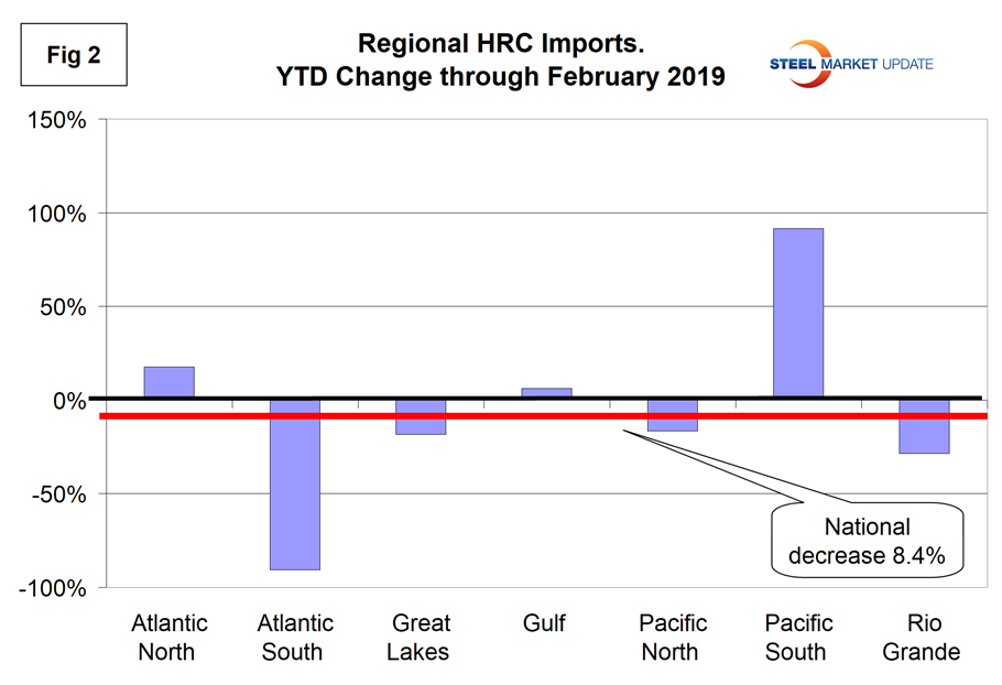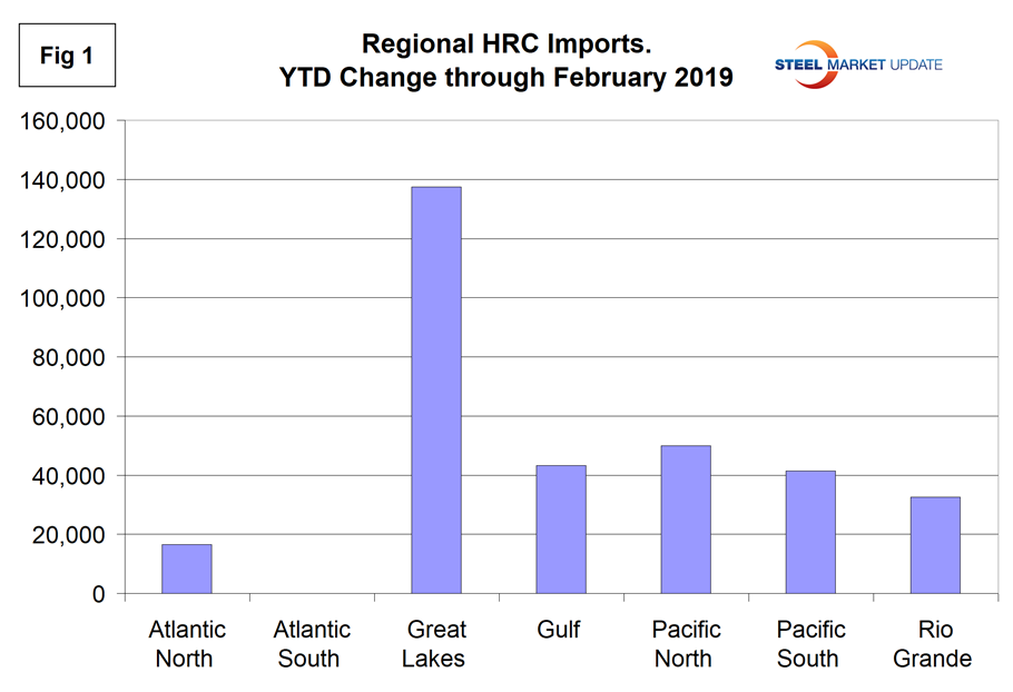 The Great Lakes continues to be the highest volume district of entry for hot rolled coil, and the Pacific South had the highest rate of increase year to date through February, according to Steel Market Update’s latest analysis of government data.