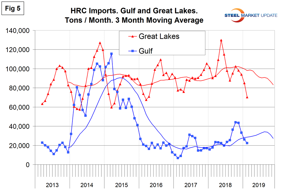 Hot rolled coil imports into the Gulf declined drastically in 2015 and have been consistently around 20,000 tons per month since then. Volume into the Great Lakes has declined every month since last October.