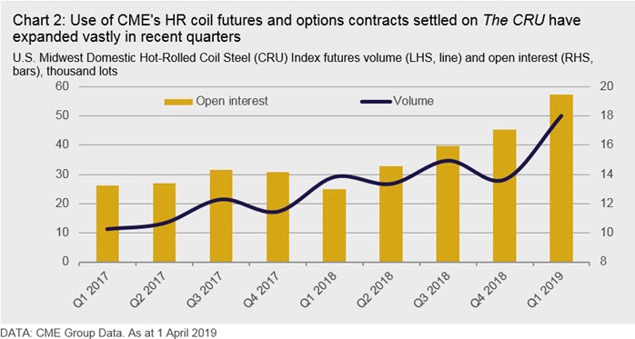 Use of CME HR coil futures and options contracts expanded greatly in 2018 and into 2019, as Chart 2 below shows. Open interest, for example, increased 14 percent y/y in 2018 Q4, over 37 percent y/y in January 2019 and 50 percent y/y in Q1 2019.