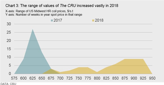 Volatility in U.S. Midwest HR coil prices increased markedly in 2018. One measure of this, standard deviation in weekly data points of “The CRU,” increased from $19 /s.t in 2017 to almost $75 /s.t in 2018 (Chart 1). Meanwhile, the range of prices across the year also increased significantly from $83 /s.t to $330 /s.t (Chart 3).