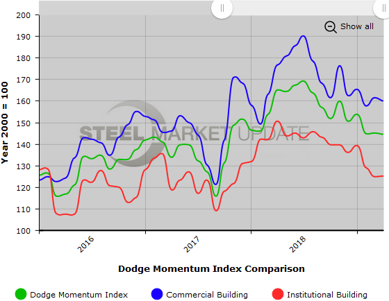 Below is a graph showing the history of the Dodge Momentum Index. You will need to view the graph on our website to use its interactive features; you can do so by clicking here. If you need assistance logging into or navigating the website, please contact us at info@SteelMarketUpdate.com.