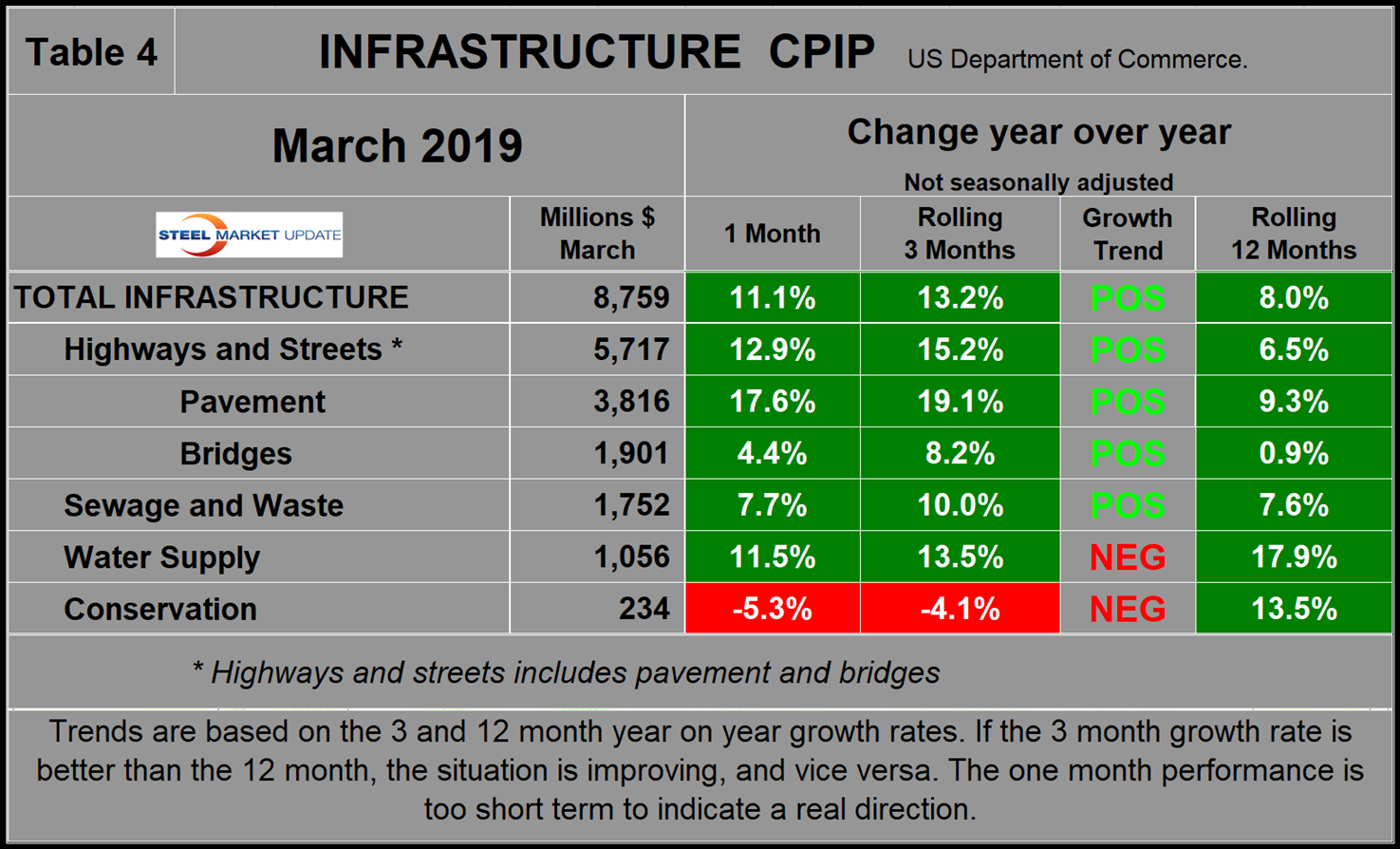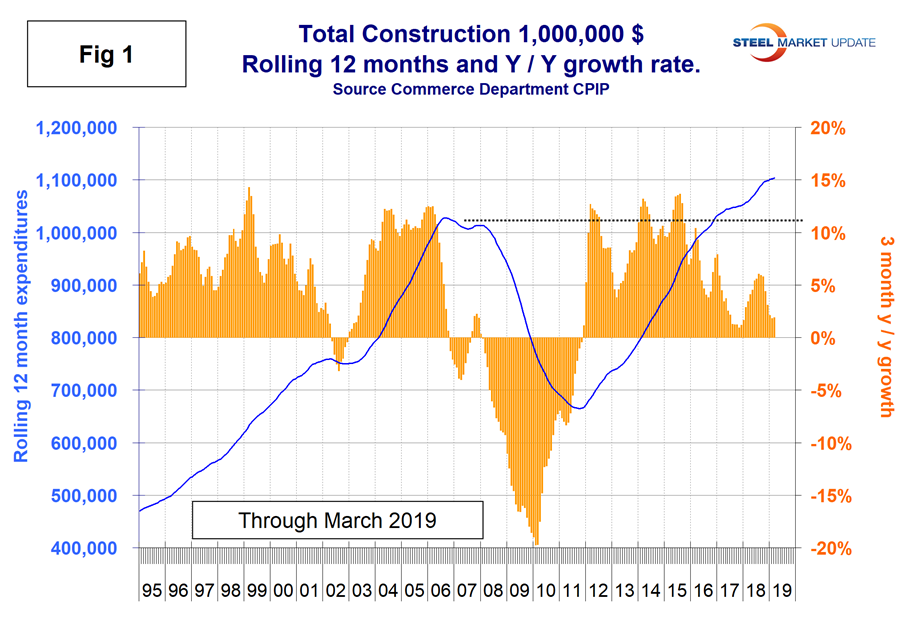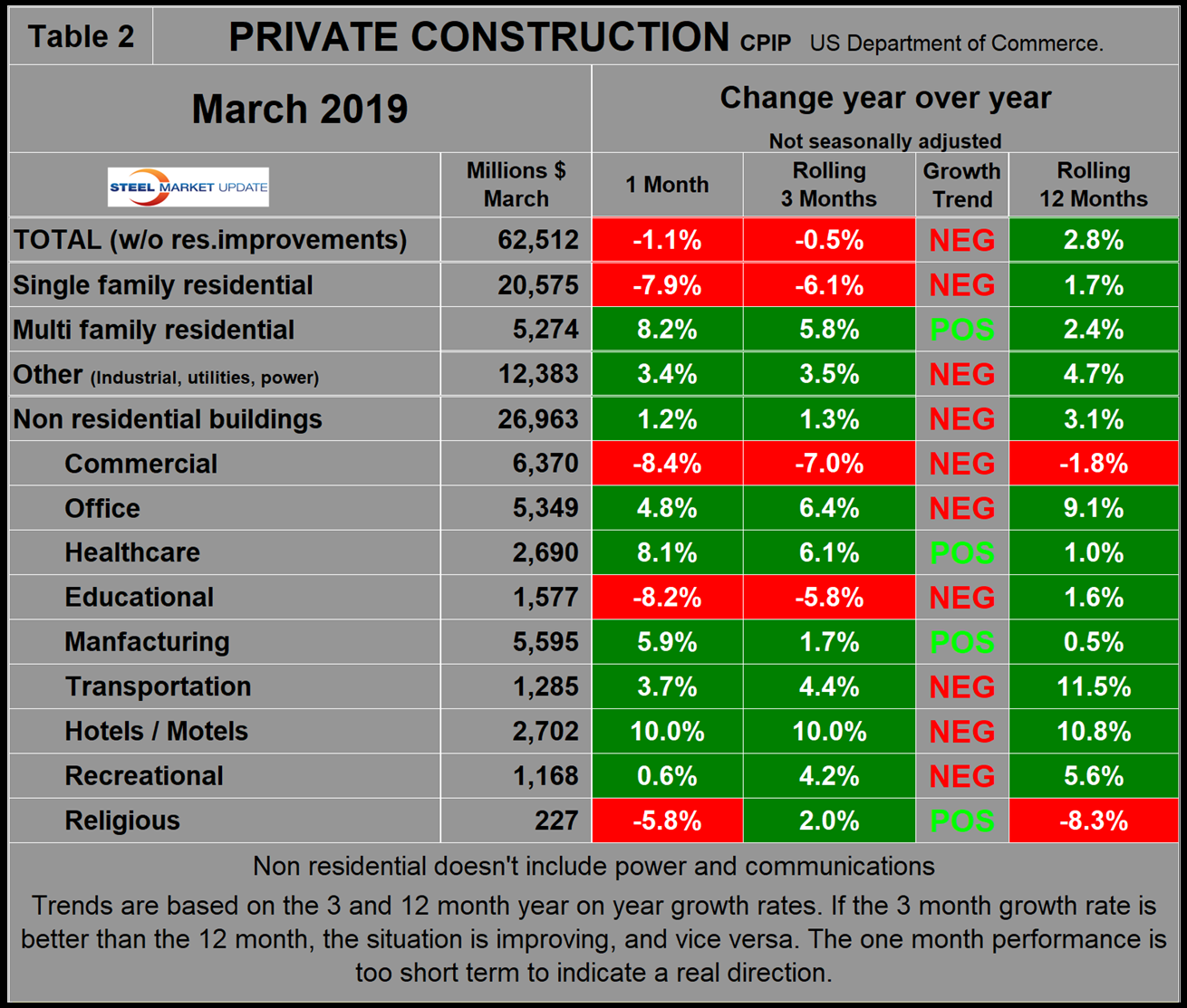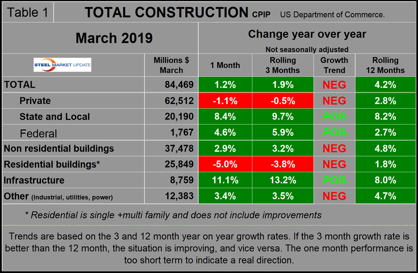 The official CPIP press release gives no appreciation of trends on a historical basis and merely compares the current month with the previous one on a seasonally adjusted basis. The background data is provided as both seasonally adjusted and non-adjusted. The detail is hidden in the published tables, which SMU tracks and dissects to provide a long-term perspective. Our intent is to provide a route map for those subscribers who are dependent on this industry to “follow the money.” This is a very broad and complex subject; therefore, to make this monthly write-up more comprehensible, we are keeping the information format as consistent as possible. In our opinion, the absolute value of the dollar expenditures presented are of little interest. What we are after is the magnitude of growth or contraction of the various sectors. In the SMU analysis, we consider only the non-seasonally adjusted data. We eliminate seasonal effects by comparing rolling three-month expenditures year over year. CPIP data also includes the category of residential improvements, which we have removed from our analysis because such expenditures are minor consumers of steel.