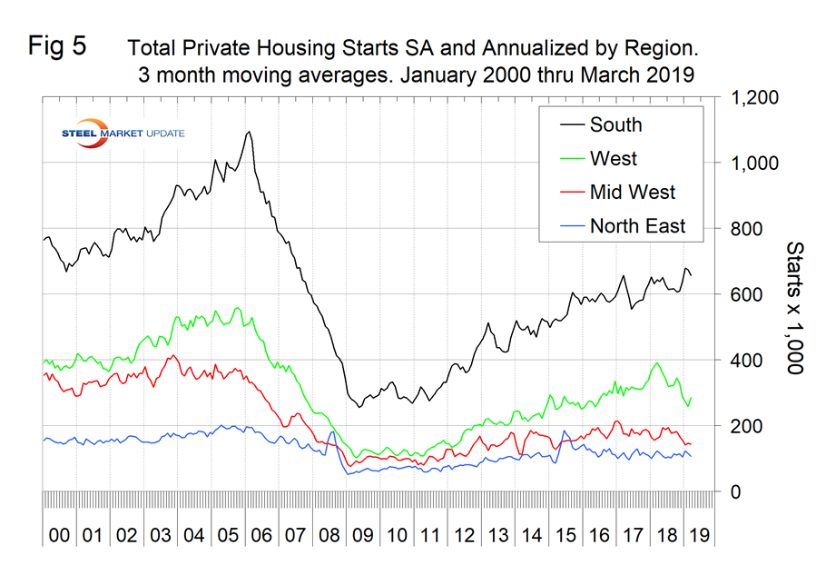 Excluding property improvements, our report shows that single-family residential contracted by 6.1 percent in three months through March with negative momentum, and multifamily residential grew by 5.8 percent with positive momentum. Housing starts as reported by the Census Bureau have trended negative since March last year. The National Association of Home Builders optimism index has been improving in 2019. Homebuilder sentiment declined continuously from January 2018 through January 2019, but improved each month from February through April. The Census Bureau reports on construction starts in their housing analysis. In the starts data, the whole project is entered into the database when ground is broken. Construction put in place is based on spending work as it proceeds; the value of a project is spread out from the project’s start to its completion. Single-family starts declined by 4.6 percent in the three months through March year over year, which was better than the contraction rate of CPIP. Multifamily starts declined by 19.5 percent, which was much worse than the rate of expansion indicated by the CPIP data. Figure 3 shows the growth of both housing sectors since January 2005 and Figure 4 shows the ratio of single-family to multi-family starts. The proportion of single family has been gradually increasing since January 2015 when the ratio was 1.66 in favor of single units to 2.56 in March 2019. Figure 5 shows total housing starts in four regions with the South being the strongest and the North East the weakest.