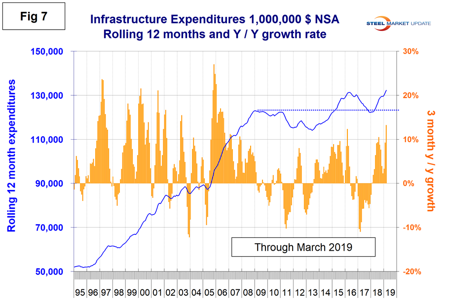 Figure 7 shows the history of infrastructure expenditures and the year-over-year growth rate.