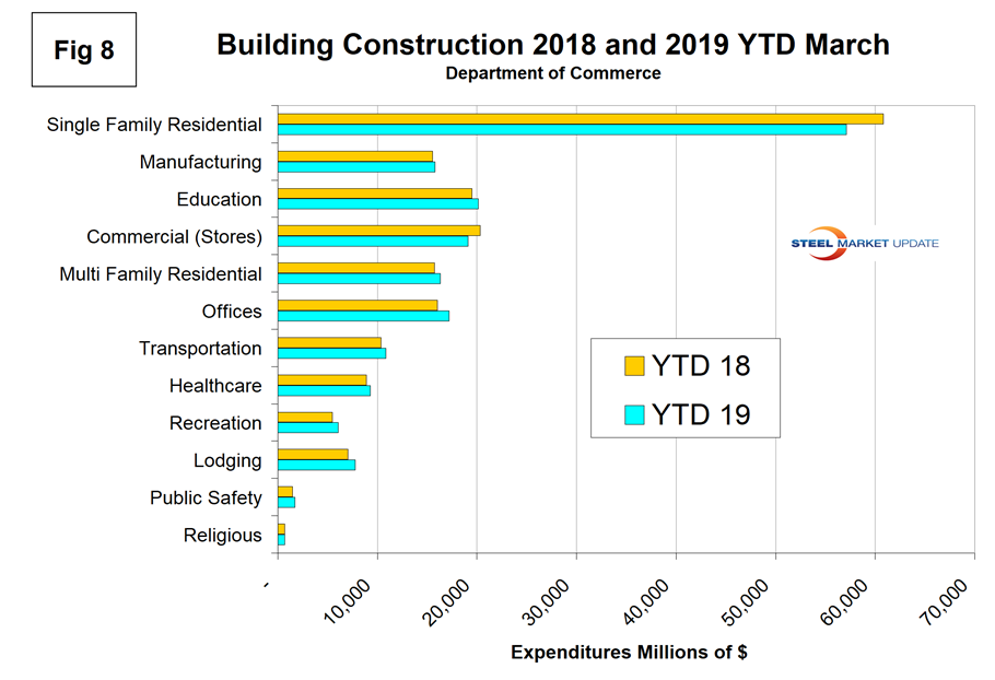 Figure 8 compares year-to-date expenditures for the construction of the various building sectors for 2018 and 2019. Single-family residential is dominant and in the 12 months of 2018 totaled $281.8 billion, up from $242.5 billion in 2016.