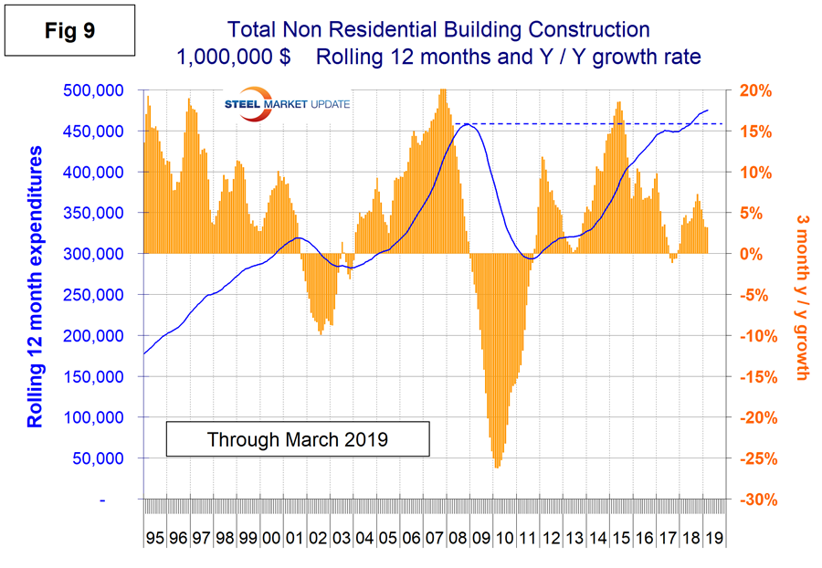 Figure 9 shows total expenditures and growth of nonresidential building construction. On a rolling 12-months basis, expenditures on nonresidential buildings including both private and S&L are at an all-time high but slowing.
