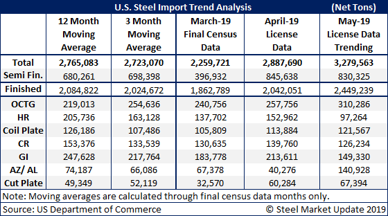 Below are two graphs covering steel imports through final March 2019 figures. You will need to view the graphs on our website to use their interactive features; you can do so by clicking here. If you need assistance logging into or navigating the website, contact us at info@SteelMarketUpdate.com.