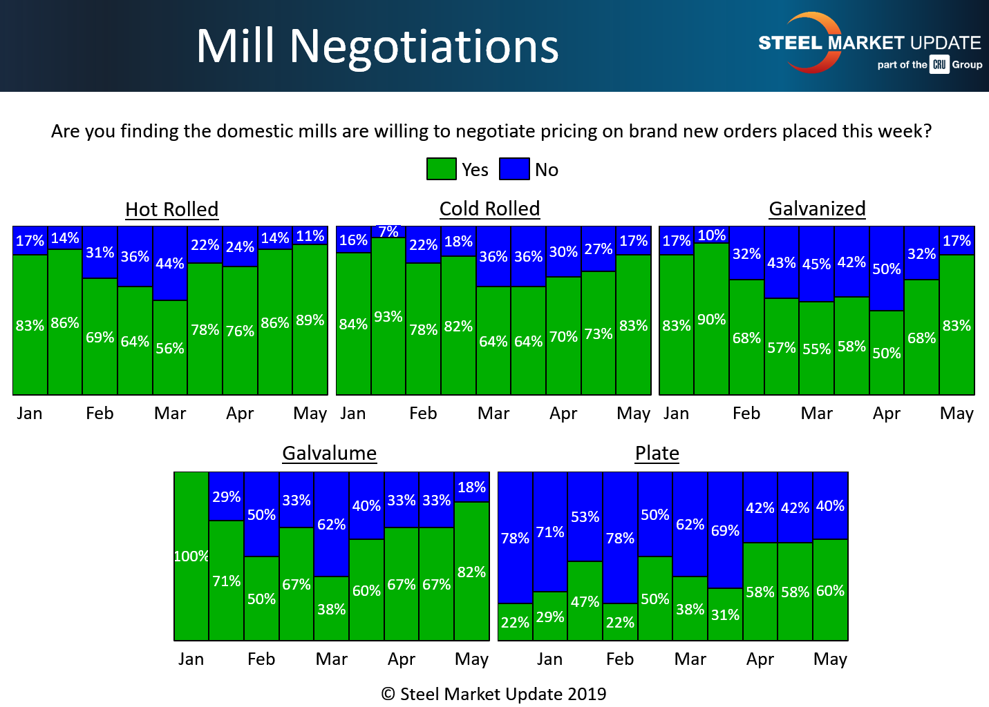 About 89 percent of respondents said the mills are open to price negotiations on hot rolled, up from 86 percent two weeks ago. Just 11 percent said the mills are currently holding the line on HR.