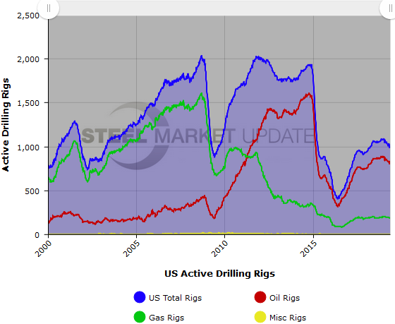 The U.S. active rotary rig count, an indicator of oil country tubular goods demand, decreased this week, according to oilfield services company Baker Hughes. The number of active U.S. rigs fell by 2 to 988, with oil rigs down 2 and gas rigs unchanged. Compared to this time last year, the 988 count is down 57 rigs, with oil rigs down 39, gas rigs down 16, and miscellaneous rigs down 2. See the first graph below for a history of active U.S. rig counts.