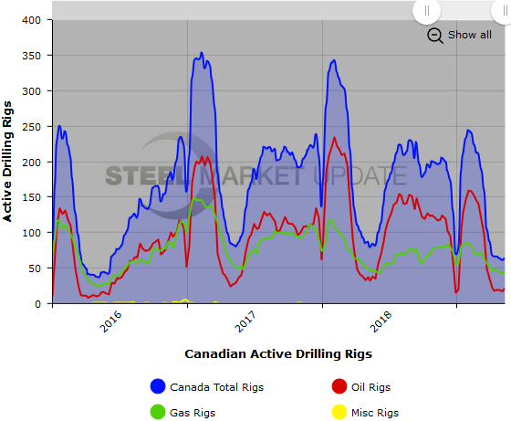 The Canadian rig count had a change of pace this week, increasing by 2 rigs to 63 rigs, with oil rigs up 5 and gas rigs down 3. Compared to last year, the 63 count is down 16 rigs, with oil rigs down 10 and gas rigs down 6. See the second graph below for a history of active Canadian rig counts.