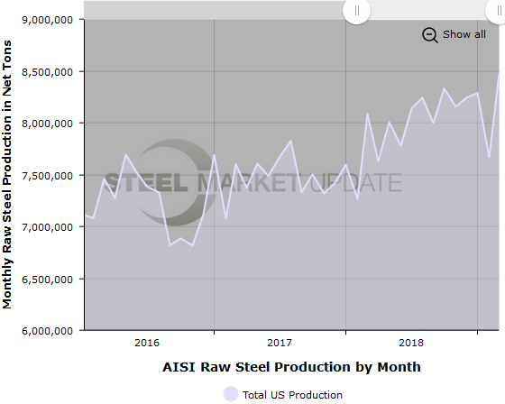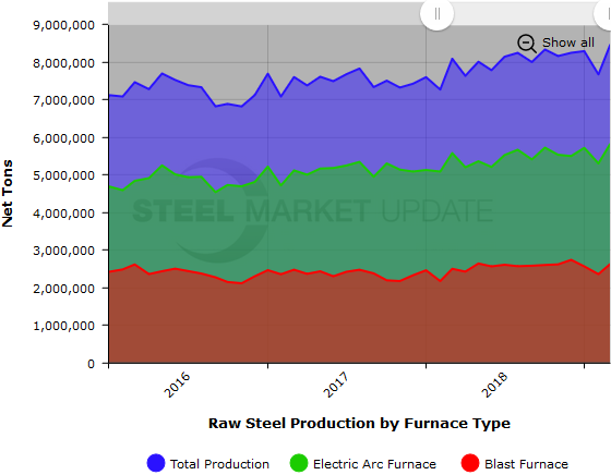Broken down by production method, 5,833,229 tons (68.9 percent) were produced by electric arc furnaces (EAFs) and 2,639,082 tons (31.1 percent) were produced by blast furnaces. The EAF production level is now at the highest seen in our nine-year history, surpassing the October 2018 high of 5,724,209 tons