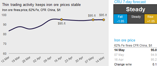 However, the uncertain geopolitical and macro environment is restraining market sentiment in terms of iron ore and steel prices. Just like Chinese steel prices, iron ore prices have also remained largely flat w/w. The Chinese yuan has weakened by another 2 percent w/w against the U.S. dollar, which is likely to be giving mills a reason to pause from seaborne spot purchases at current prices. On Tuesday, May 14, CRU assessed the 62% Fe fines price at $95 /t, virtually flat w/w.
