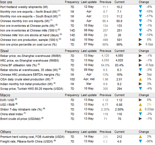On the supply side, shipments from Port Hedland declined by 0.9 Mt w/w to 10.2 Mt. The Australian financial year ends in June and history demonstrates that iron ore shipments from Australia tend to be strong during that month. We expect this year to be no different and we project Australian shipments to recover to ~11 Mt per week in the coming weeks, barring any unforeseen logistical disruptions. According to our sources, Indian exports of low-grade iron ore and even pellets is holding strong in the wake of high international prices. In separate news, we heard that Roy Hill is revising its mine plan to support consistent product grade, which will result in significantly higher stripping ratios. This will materially increase mining costs for the miner.