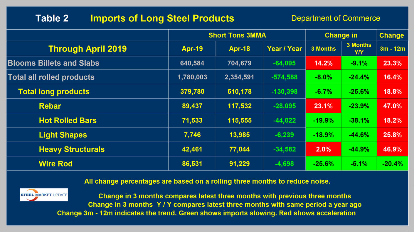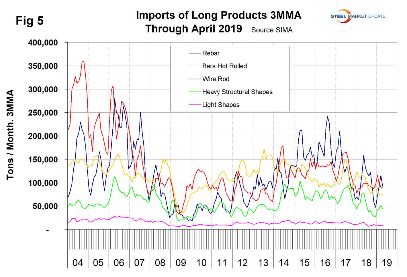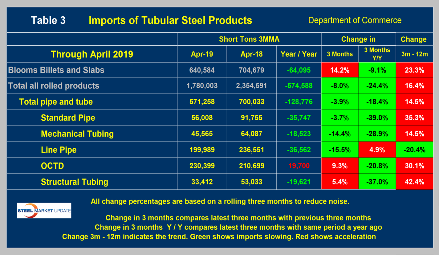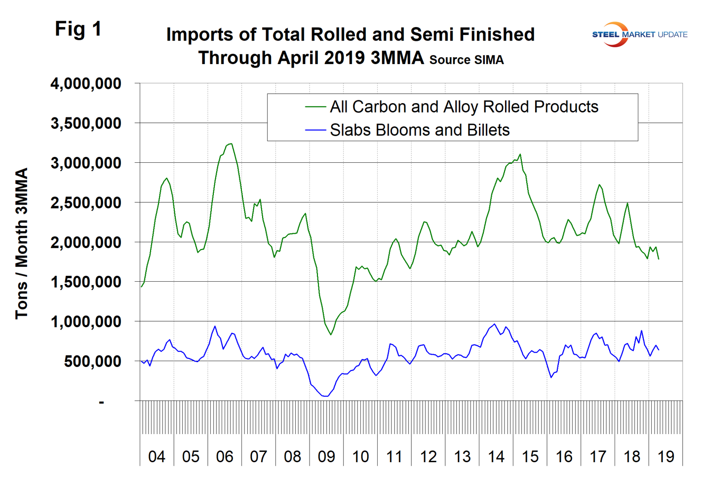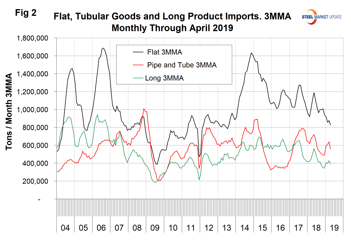 Total rolled products imports in the nine months August 2018 through April 2019 have been consistent, ranging from 1.78 million to 1.96 million tons on a 3MMA basis. In April, the 3MMA was 1.78 million tons, therefore at the very bottom of the range. Year over year on a 3MMA basis, sheet products were down by 29.2 percent, plate products were down by 20.5 percent, long products were down by 25.6 percent, and tubulars were down by 18.4 percent. In the 12 months of 2018, total rolled product imports were down by 9.9 percent from 2017, but were almost exactly the same as in 2016. Imports of flat rolled, tubulars and longs all peaked in May last year. Since then total flat rolled (sheet and plate) has consistently declined, which may be tariff driven. This is not so clear for longs and tubulars where the decline since May has been less consistent.