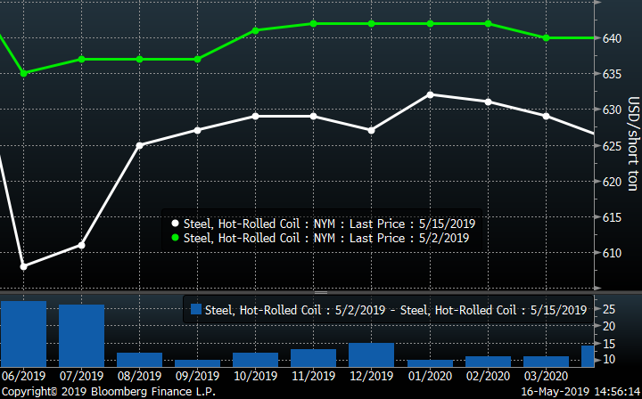 The developments around the USMCA–which started on April 28 with Iowa Senator Chuck Grassley’s Wall Street Journal op-ed and then was followed yesterday with Treasury Secretary Mnuchin’s comments that a deal is close that would remove the 25 percent tariffs on steel imported from Canada and Mexico–look to be taking $10-$15 chunks out of near-term HRC futures after each incident.
