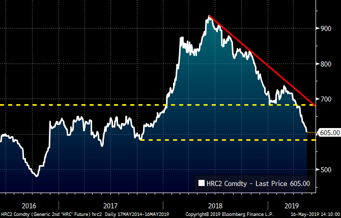 Service center inventory data showed a sharp destocking at the beginning of 2019 that hasn’t been replaced. Is the $600 level low enough to get service centers to restock? Or do prices have to fall further and faster to entice the larger service centers to put their capital to work? Keep an ear out for rumors of transactions of massive tons placed at a steeply discounted eye-opening price.