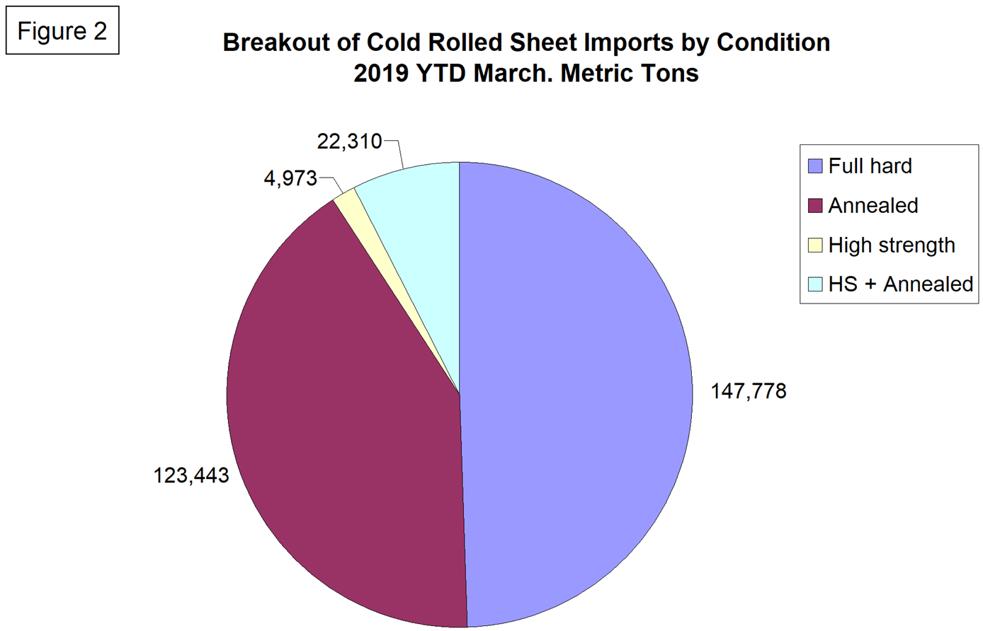 Through March 2019, of the total cold rolled sheet and strip imports into the U.S., only 2.5 percent was strip. By gauge range the sheet broke down to: 26 percent < 0.5mm, 30 percent ≥ 0.5 to 1.0 mm, 43.5 percent > 1 to 3mm thick and 0.5 percent > 3 mm.