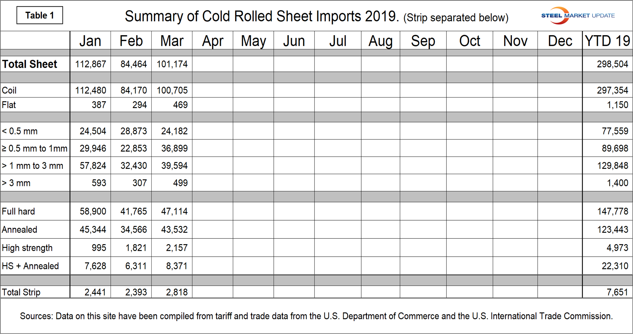 Table 1 is a summary for 2019 through March of cold rolled imports showing gauge ranges and condition and the annual year-to-date total for sheet. Strip is itemized separately at the bottom of the table.
