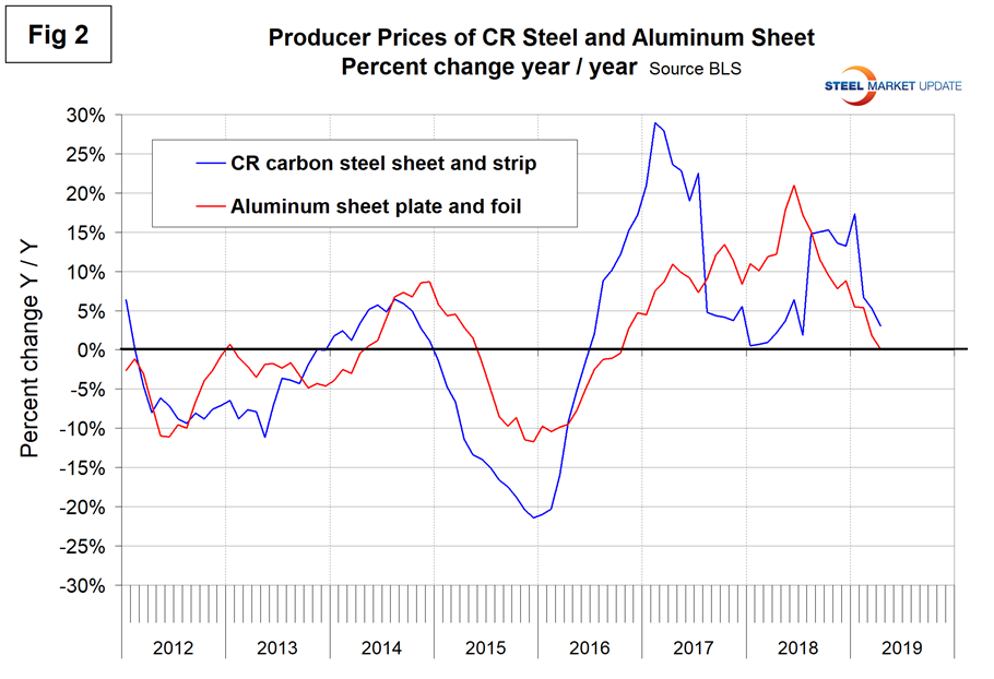 Figure 2 shows the year-over-year comparison of the price change of cold rolled steel sheet and flat rolled aluminum. The lines crossed in September last year and since then the competitiveness of steel has been losing ground to aluminum. In April 2019, the rate of change of the price indexes was 3.1 percent for steel and 0.1 percent for aluminum, both year over year.
