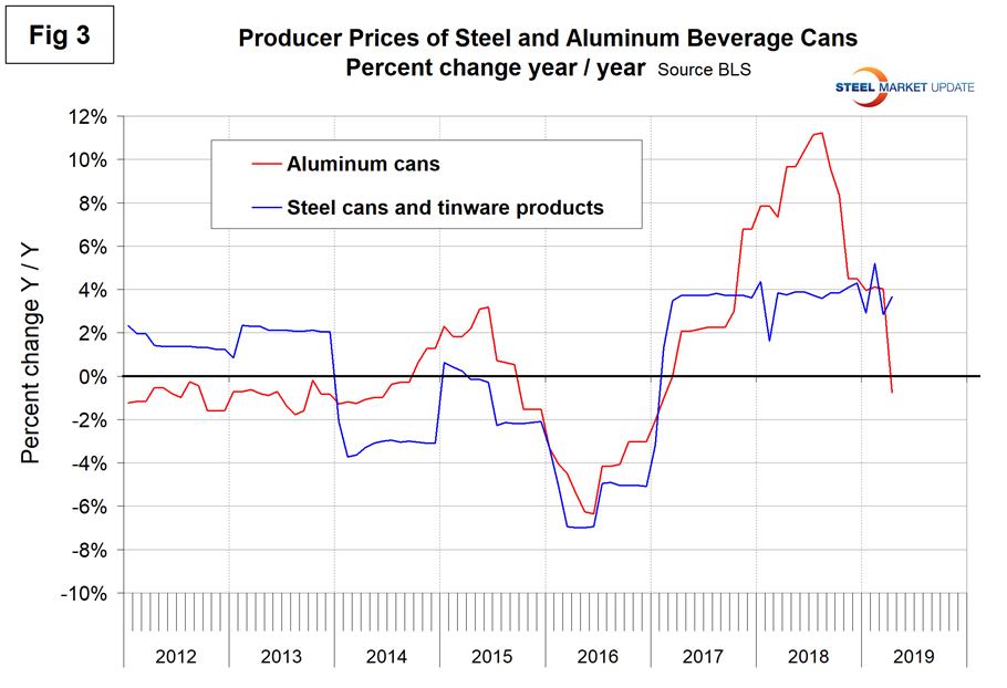Figure 3 shows the same comparison for steel tinware products and aluminum cans. The competitiveness of their raw materials has carried through to the finished product.