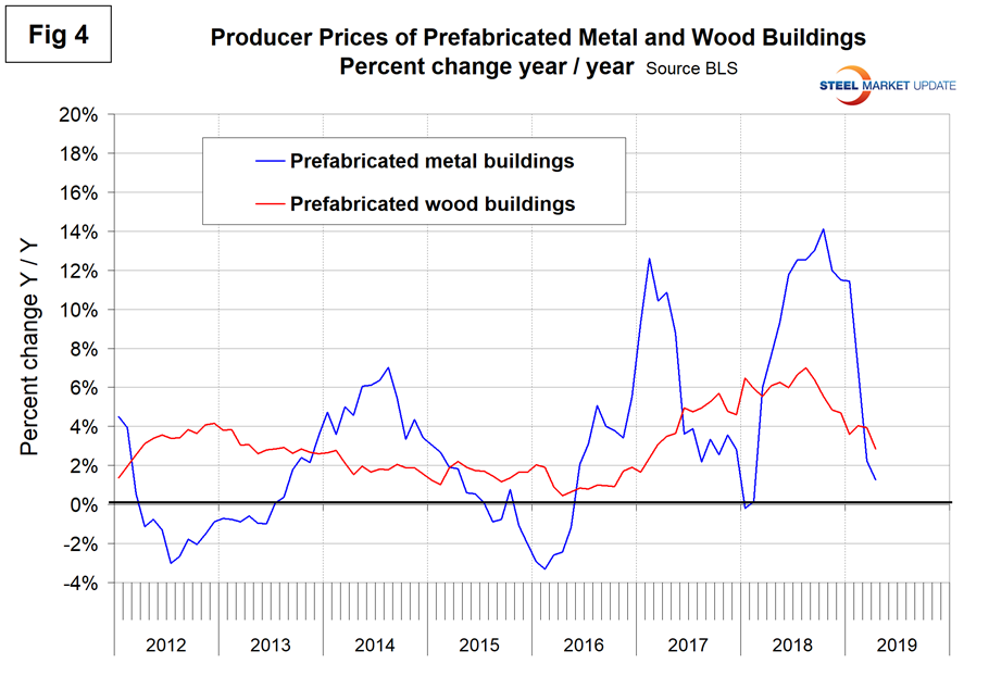 Figure 4 compares prefabricated metal with prefabricated wood buildings. The rate of increase of the price of steel buildings has become less than for wood for the first time since March last year.