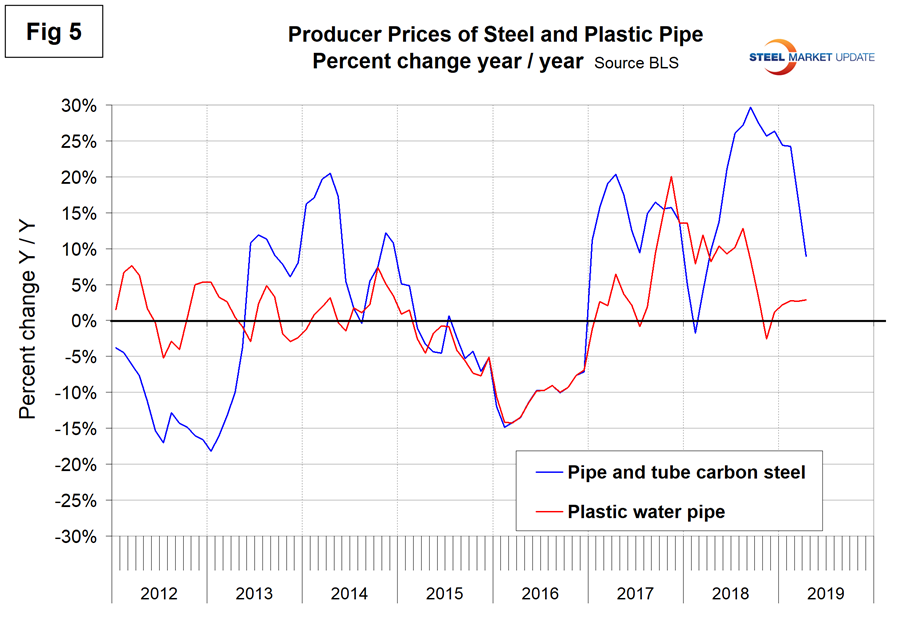 Figure 5 compares the price changes of steel and plastic pipe, which moved in opposite directions to the detriment of steel in 2018. The PPI of steel pipe had declined this year, but is still disadvantageous.