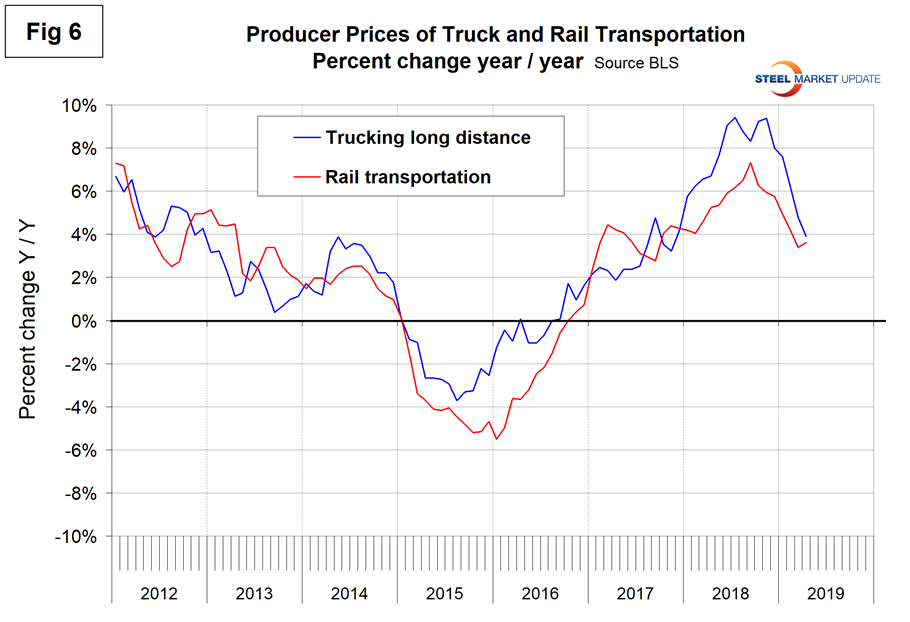 Figure 6 compares the changes in the price of truck and rail transportation. The escalation of trucking prices has exceeded those of rail almost every month since January 2015. Both have declined in the last six months and in April almost converged.