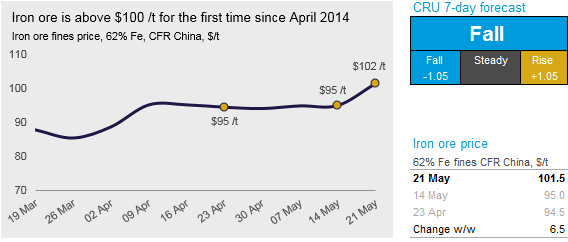 Iron ore prices have risen sharply in the past week as the strong Chinese demand has continued and fears of further supply disruptions have emerged in Australia and Brazil. On Tuesday, May 21, CRU has assessed the 62% Fe fines price at $101.5 /t, which translates to a $6.5 /t increase w/w.