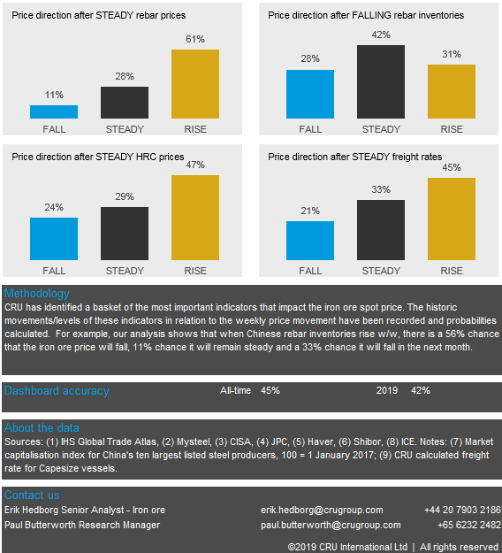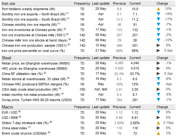 In the past week, Vale has announced that a mine wall at the depleted Gongo Soco mine pit is likely to collapse, which could trigger the failure of yet another tailings dam. However, the mine and dam are not in operation and they are also located far away from Vale’s other production. The nearby village was evacuated in February, so the risk to human lives is minimal. Rail transportation passing by the town has been suspended, which is affecting passenger traffic as well as some iron ore transportation. In Australia, there has also been news circulating in the market about BHP carrying out maintenance in July, which has caused further supply fears. However, maintenance takes place in July every year and we do not expect this round of maintenance to be much more extensive than in previous years. Furthermore, there has been a mine accident in China’s Heilongjiang province at a new 0.9 Mt capacity mine and beneficiation plant. The impact on iron ore mining activities elsewhere in China remains unclear.