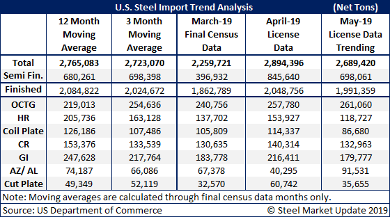 Below are two graphs covering steel imports through final March 2019 figures. You will need to view the graphs on our website to use their interactive features; you can do so by clicking here. If you need assistance logging into or navigating the website, contact us at info@SteelMarketUpdate.com.