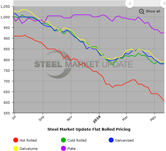 SMU Note: Below is a graphic showing our hot rolled, cold rolled, galvanized, Galvalume and plate price history. This data is available here on our website with our interactive pricing tool. Note that plate prices are not yet available on our website, but we are in the process of adding that dataset. If you need help navigating the website or need to know your login information, contact us at info@SteelMarketUpdate.com or 800-432-3475.