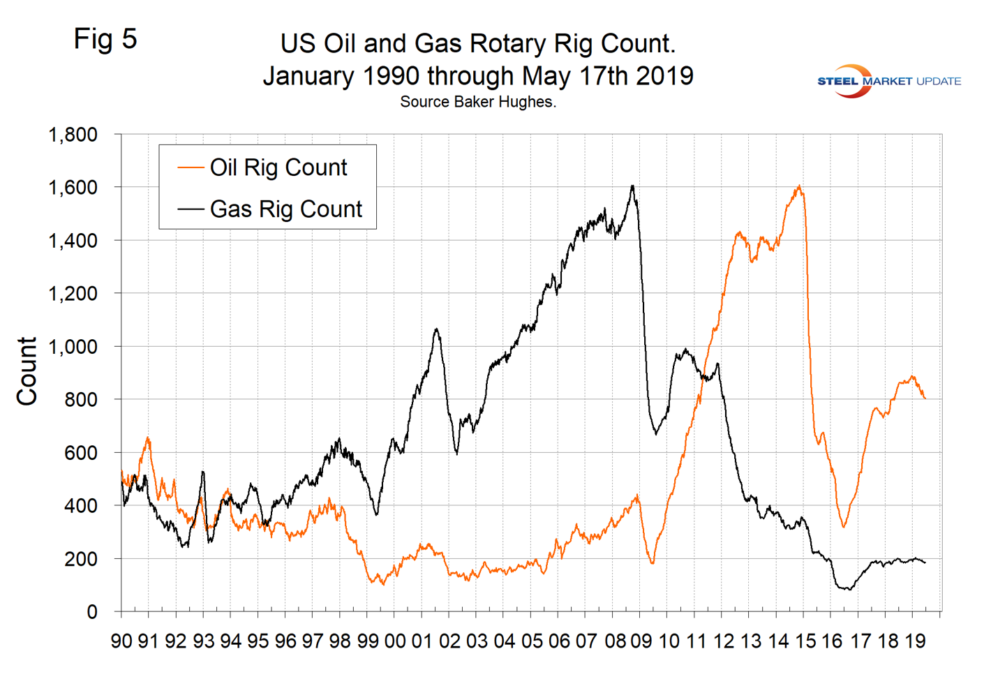 The U.S. gas rig count rose from its low point of 81 on Aug. 5, 2016, to 185 on May 17, 2019. The year-over-year growth rate of total U.S. operating rigs was negative 5.6 percent in the latest data with oil down by 5.0 percent and gas down by 7.5 percent. Figure 5 shows the Baker Hughes U.S. Rotary Rig Counts for oil and gas equipment in the U.S. (explanation below).
