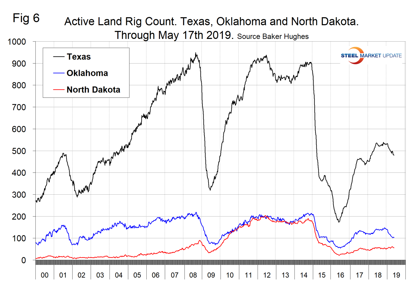 The spot price of West Texas Intermediate (WTI) FOB Cushing, Okla., reached $66.24 / barrel on April 20 and had declined to $60.97 on May 13. The total number of operating rigs exploring for oil has declined by 88 since Jan. 4. The prices of oil and natural gas drive the consumption of energy-related steel products including oil country tubular goods, pipe fittings and well head equipment, among others. Welded tubular goods (not including OCTG) consumed about 5.5 million tons of hot rolled sheet in 2018.