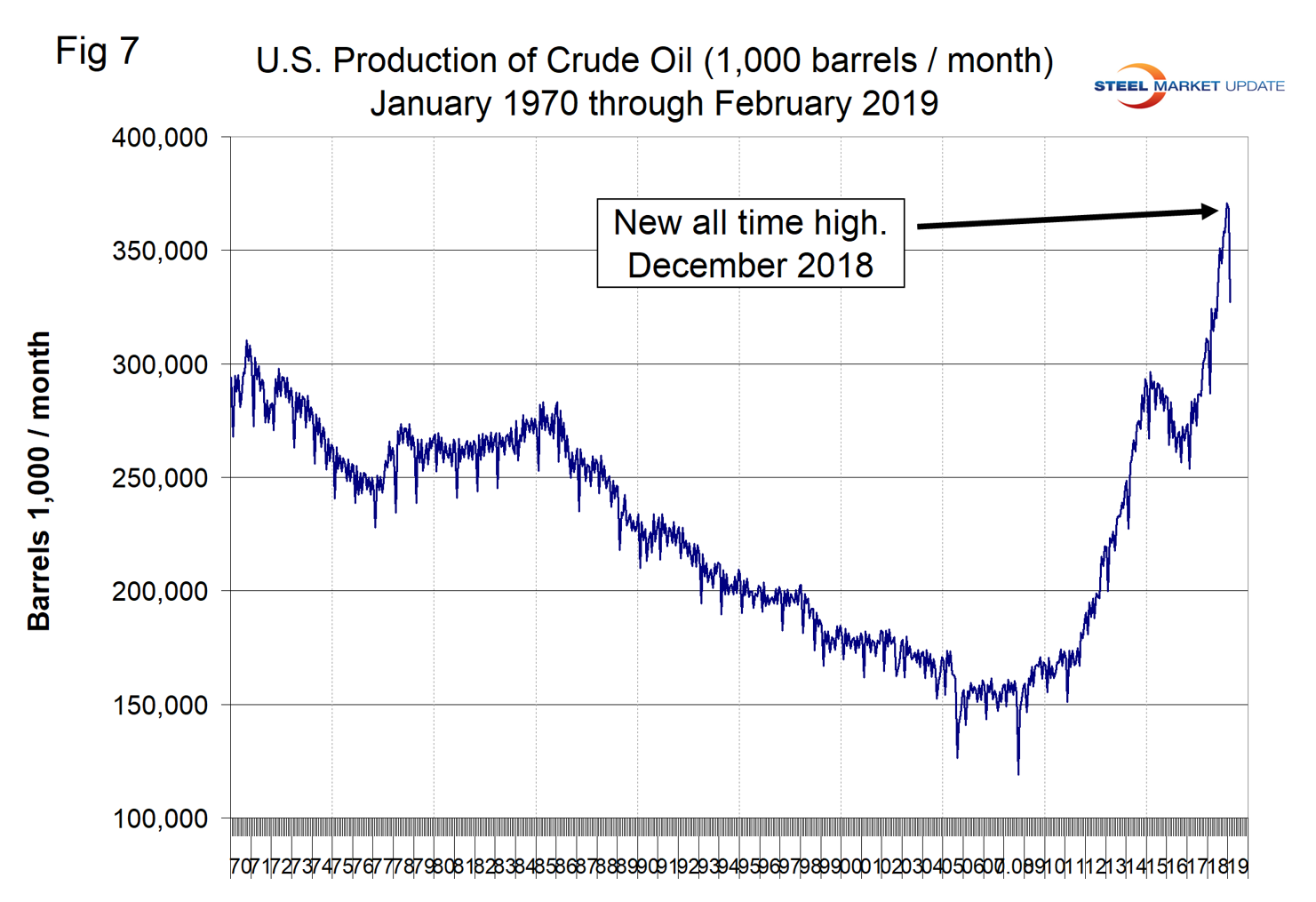 Figure 7 illustrates the monthly U.S. oilfield production of crude from January 1970 through February 2019 (latest data available) in thousands of barrels per month. The historical high was October 1970 at 310.4 million barrels. Production steadily declined to half that level in the late 2000s before the fracking revolution. December 2017 broke the record that had stood for 47 years with 310.7 million barrels produced and December 2018 set a new record at 370.8 million barrels. February 2019 saw a sharp decline to 327 million barrels.