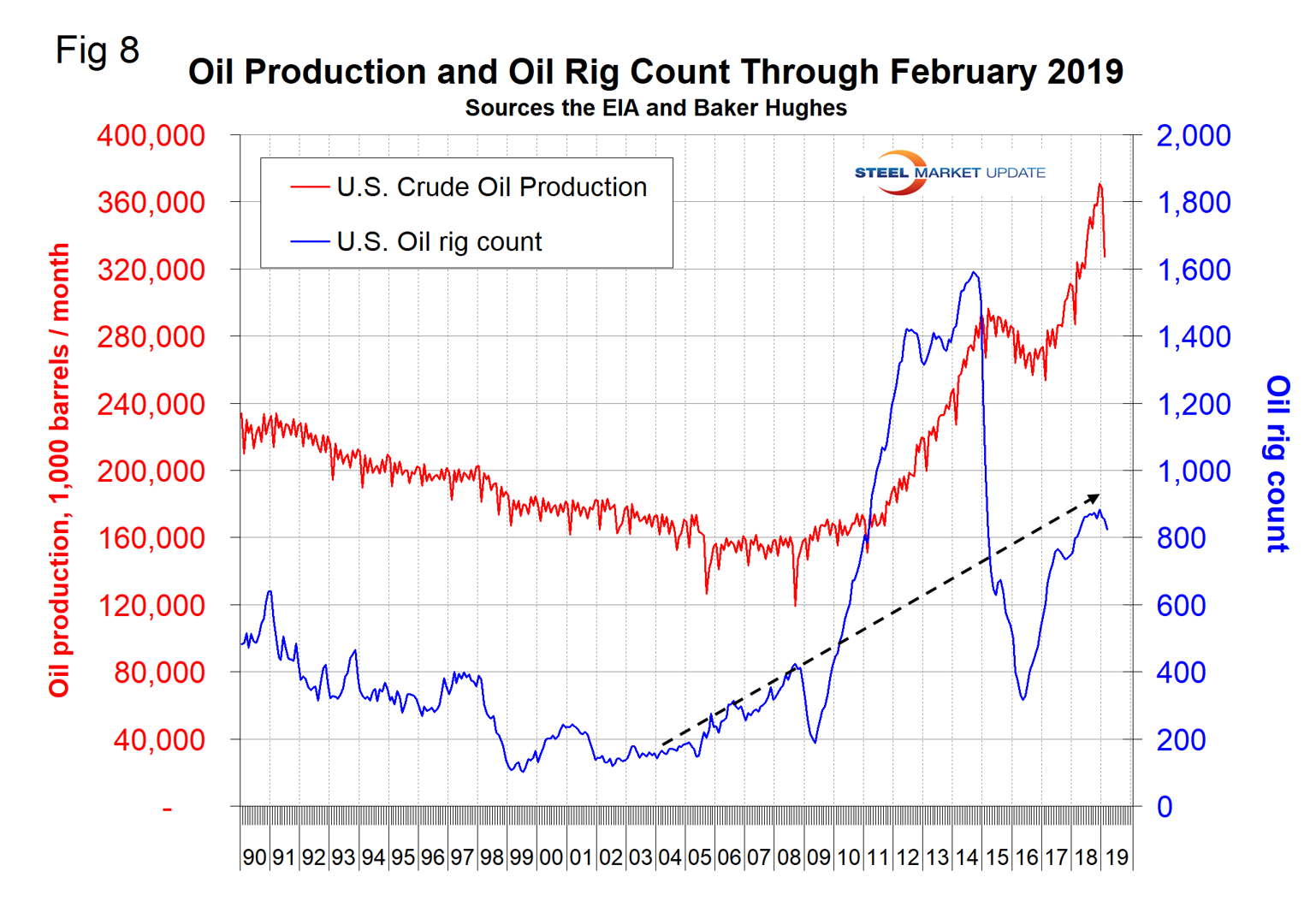 Figure 8 compares oil production and the oil rig count and shows how the increase in exploratory wells drove production from 2009 through late 2014 when the oil price collapsed. Rig count and production have declined synchronously in 2019.