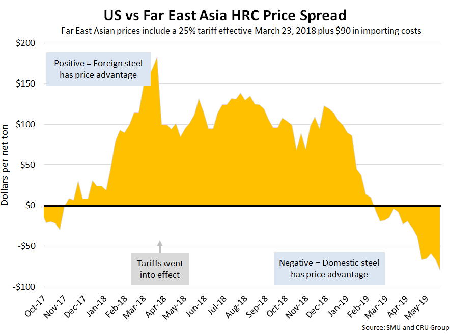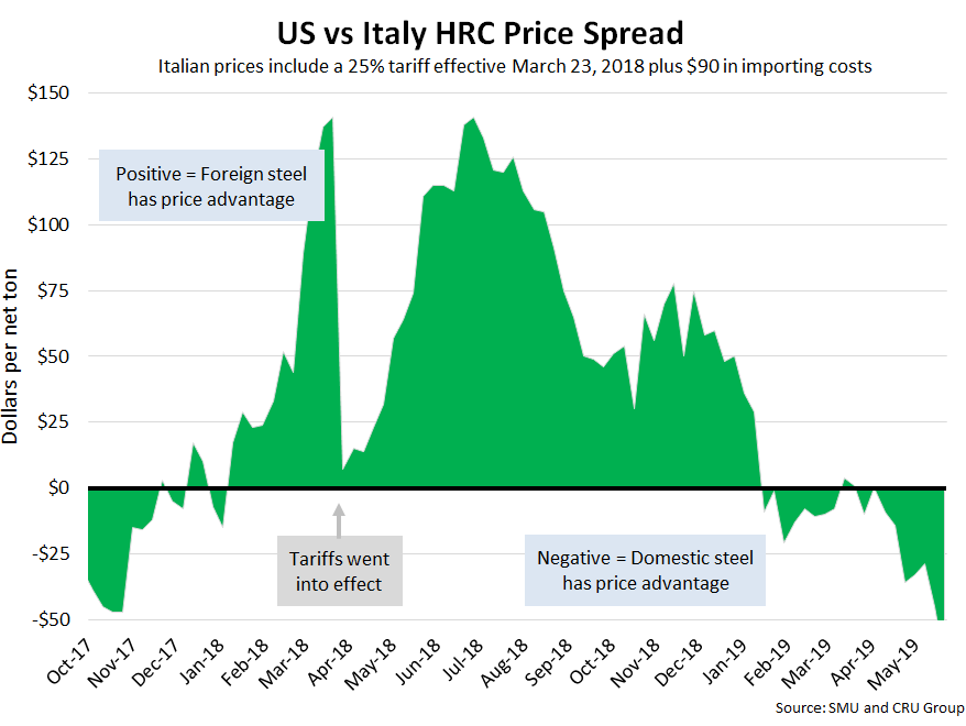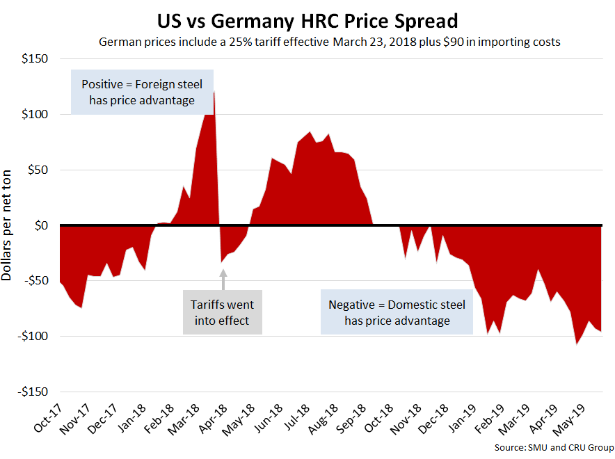 SMU now includes a 25 percent import tariff in our foreign vs. domestic price calculations, effective on foreign prices after March 23, 2018. We then add $90 per ton to the foreign prices in consideration of freight costs, handling, trader margin, etc. This provides an approximate “CIF U.S. ports price” that can then be compared against the SMU U.S. hot rolled price. The difference between the domestic and foreign hot rolled prices is then referred to as the “price spread.” As the price spread narrows, the competitiveness of imported steel into the United States is reduced. If the spread widens, then foreign steel becomes more attractive to U.S. flat rolled steel buyers. A positive spread means foreign steel has a price advantage (U.S. prices are higher than foreign prices), while a negative spread means domestic steel has a price advantage (U.S. prices are less than foreign prices). Note that we do not include any anti-dumping (AD) or countervailing duties (CVD) in this analysis.