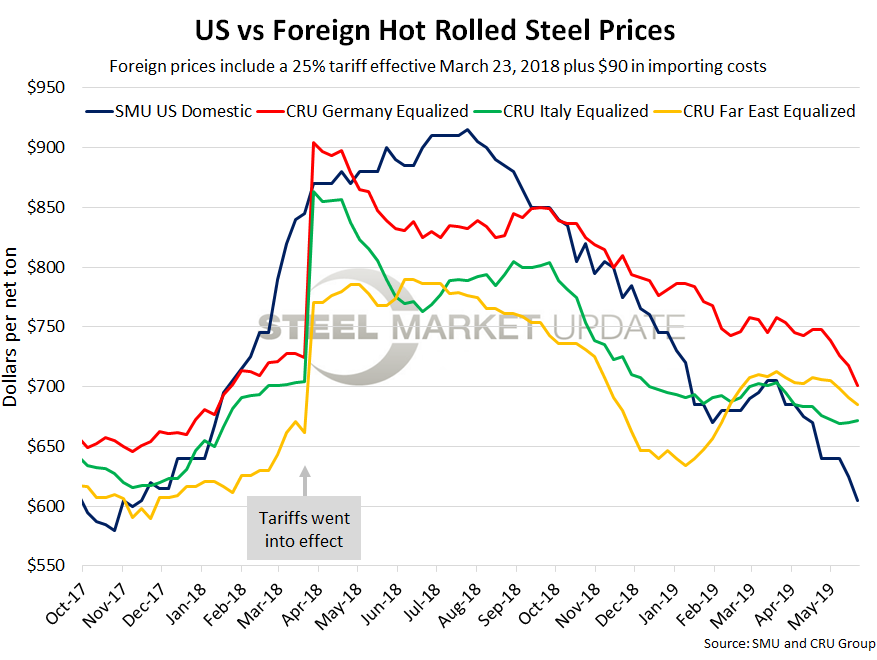 The graph below shows all four prices together and points out the effective date of the tariffs. Foreign prices are referred to as “equalized,” meaning they have been adjusted with the tariffs and importing costs for an apples-to-apples comparison against the U.S. price.